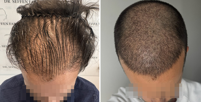 Pour ce patient, nous avons concentré le travail sur la restauration et la redensification des deux tiers antérieurs du cuir chevelu, zone clé pour le cadrage du visage et l’harmonie globale. En renforçant cette zone, nous avons pu recréer une ligne frontale plus marquée, améliorer la densité et redonner une apparence plus jeune, plus dynamique et plus confiante, exactement comme elle devrait l’être.